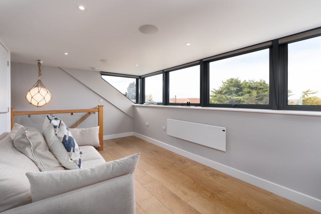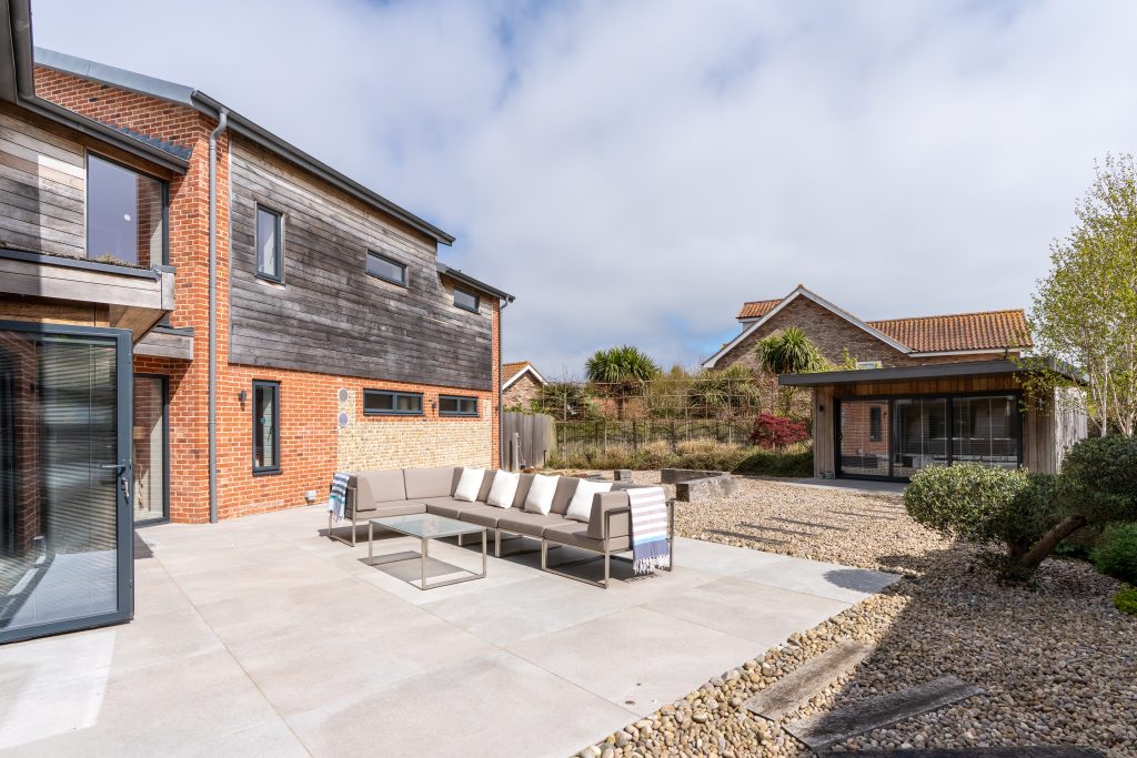 The homes incorporate a carefully considered palette of materials that balance contemporary design with the character of the local area. Traditional flint walls anchor the development within its coastal setting, complemented by natural iroko timber detailing and red brickwork. A zinc roof adds a sleek, modern finish, creating a cohesive aesthetic that is both timeless and distinctive.